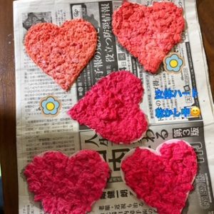 用意が出来たらハート型の台紙の上に敷き詰めて立体的に仕上げ乾かします![]()