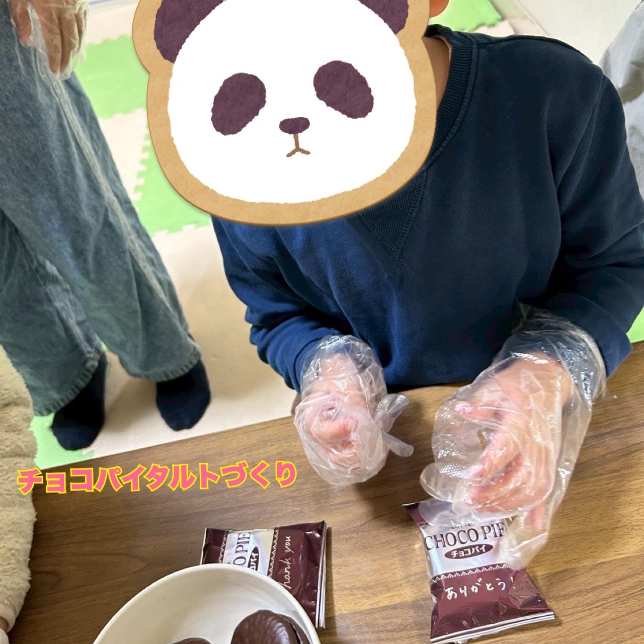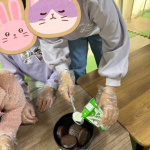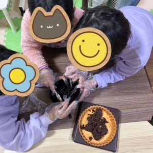 おともだちとペアやグループになって、チョコパイを潰す作業・チョコパイと牛乳を混ぜ生地をつくる作業・タルト台にできあがった生地を流す作業を行っています!